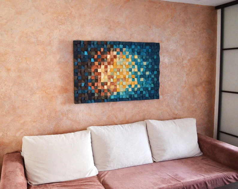 The Universe - Wood wall art in navy blue yellow orange brown, Wood mosaic sculpture, Abstract painting on wood, 3 d wall art decor