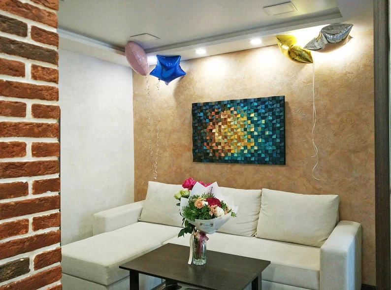 *** Please note that custom-made panels may and will be different from the original, presented on the photo. The texture of wood, colors and shades of coloring can not be copied, each time it is an individual work and a completely unique product, but with the desire for the original idea. Pieces are made of one size elements, and their number will be different depending from the size. Dimensions of finished products can change for +/- 1'' (2,5 cm).